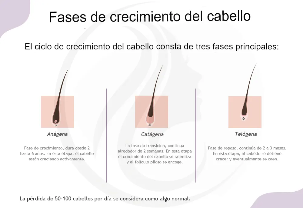 - Anágeno: fase de crecimiento activo, que dura de 2 a 6 años. En esta fase permanece una mayoría (alrededor de 85-90%) de nuestro cabello.