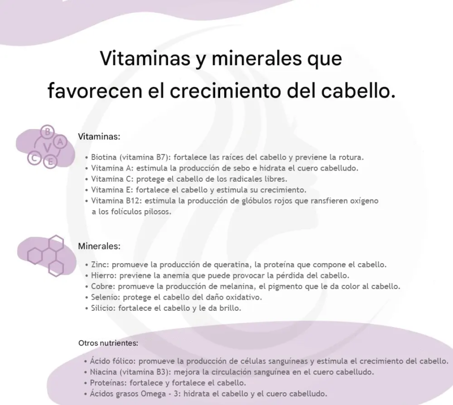 | Zinc | Regula el funcionamiento de las glándulas sebáceas, está involucrado en la síntesis de proteínas y es necesario para el crecimiento adecuado del cabello. | Semillas de calabaza, mariscos (especialmente ostras), carne roja, granos de trigo sarraceno. |